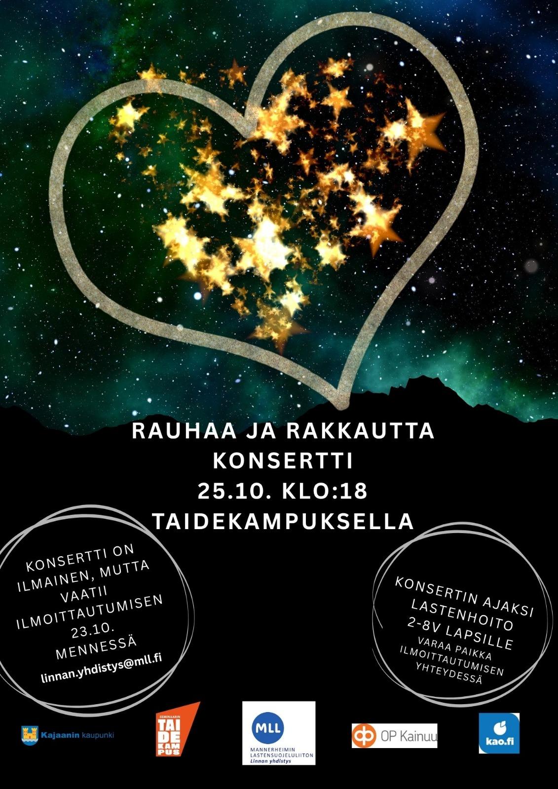 MLL Linnan yhdistys järjestää yhteistyössä Kajaanin Ammattiopiston, Kajaanin kaupungin, Seminaarin taidekampuksen sekä OP Kainuun kanssa Rauhaa ja rakkautta -konsertin lauantaina 25.10.2025 klo 18 alkaen taidekampuksella. Paikalla myös lastenhoito 2-8-vuotiaille lapsille konsertin ajaksi. Konsertti on maksuton. Ilmoittautuminen vaaditaan.